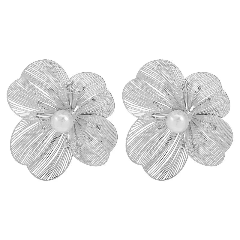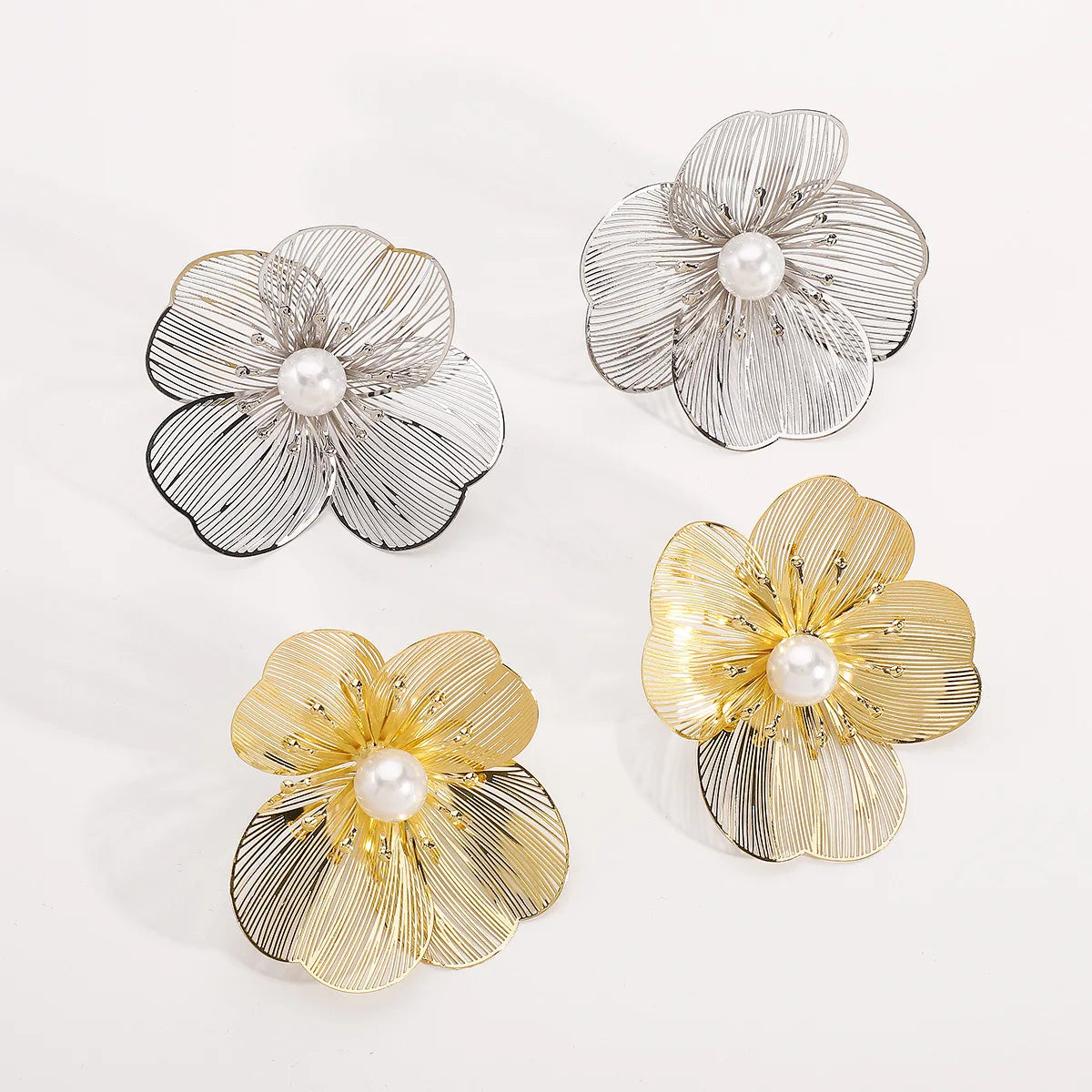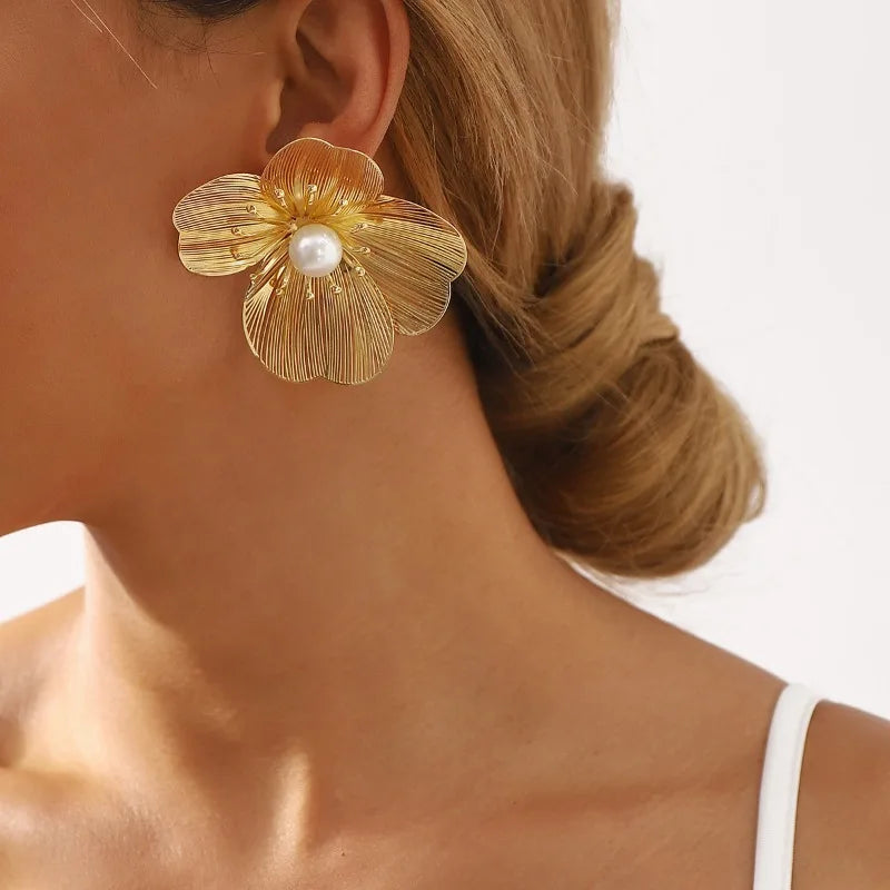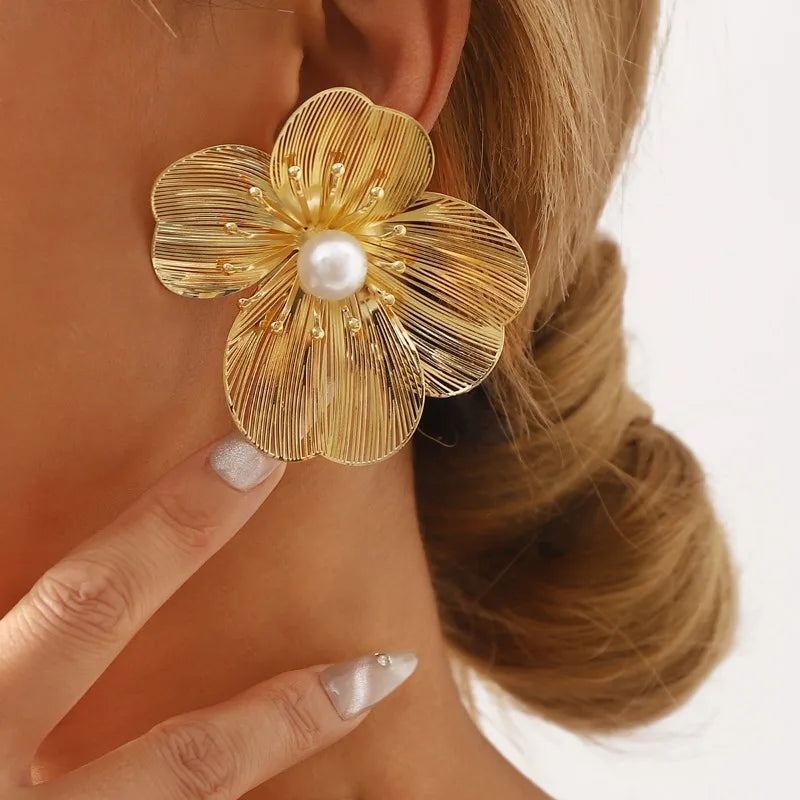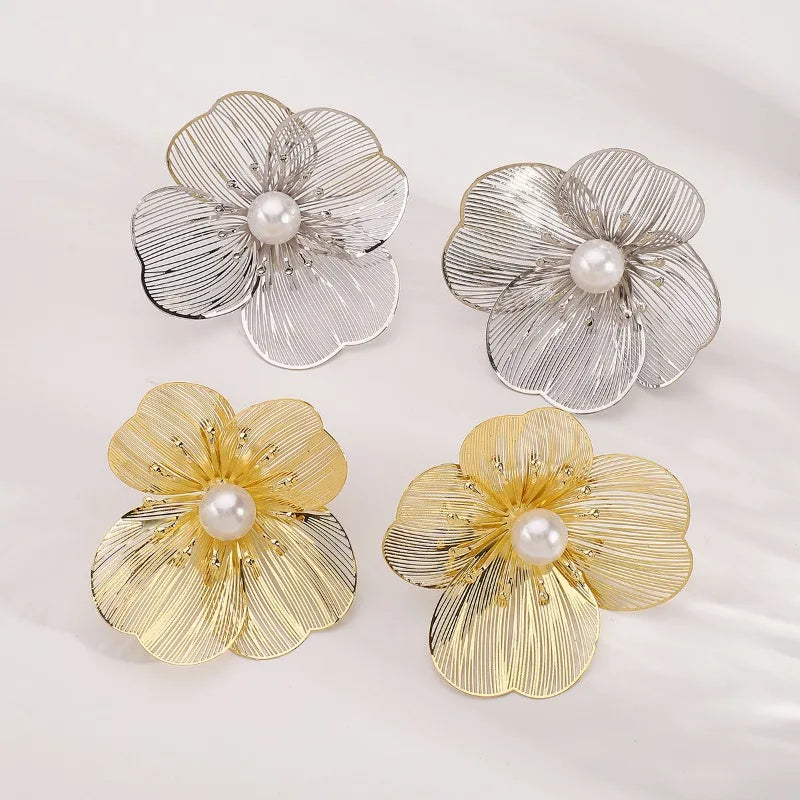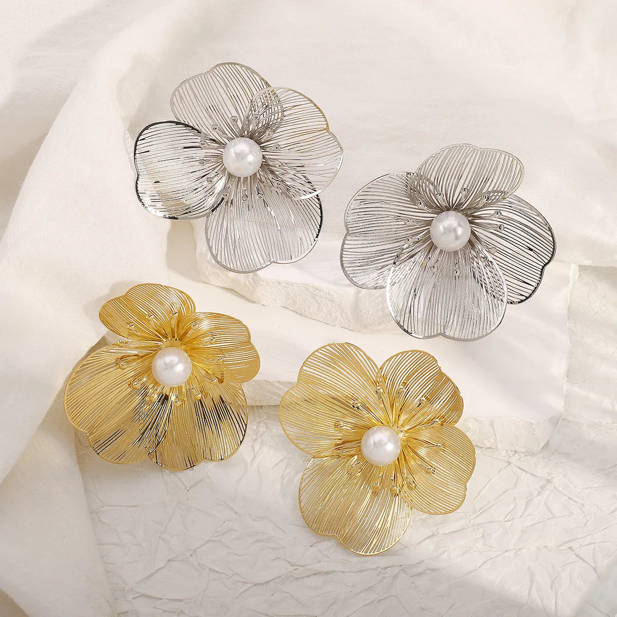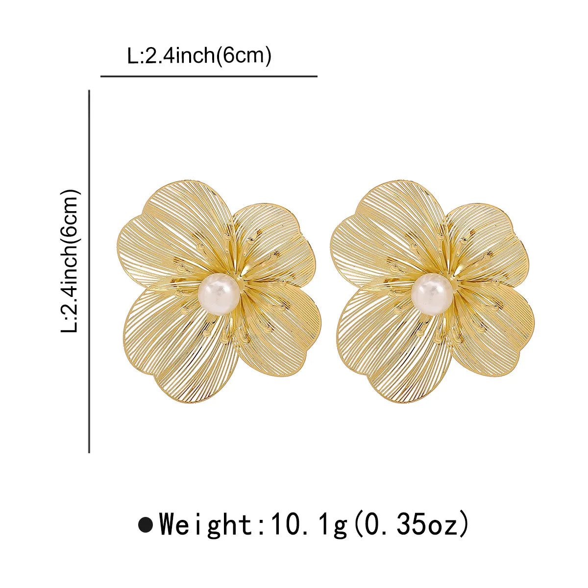 Gold Color Big Petal Hollow Flower withe Pearl Earrings for Women Exaggerated Trend Metal Irregular Earrings Ladies Jewelry